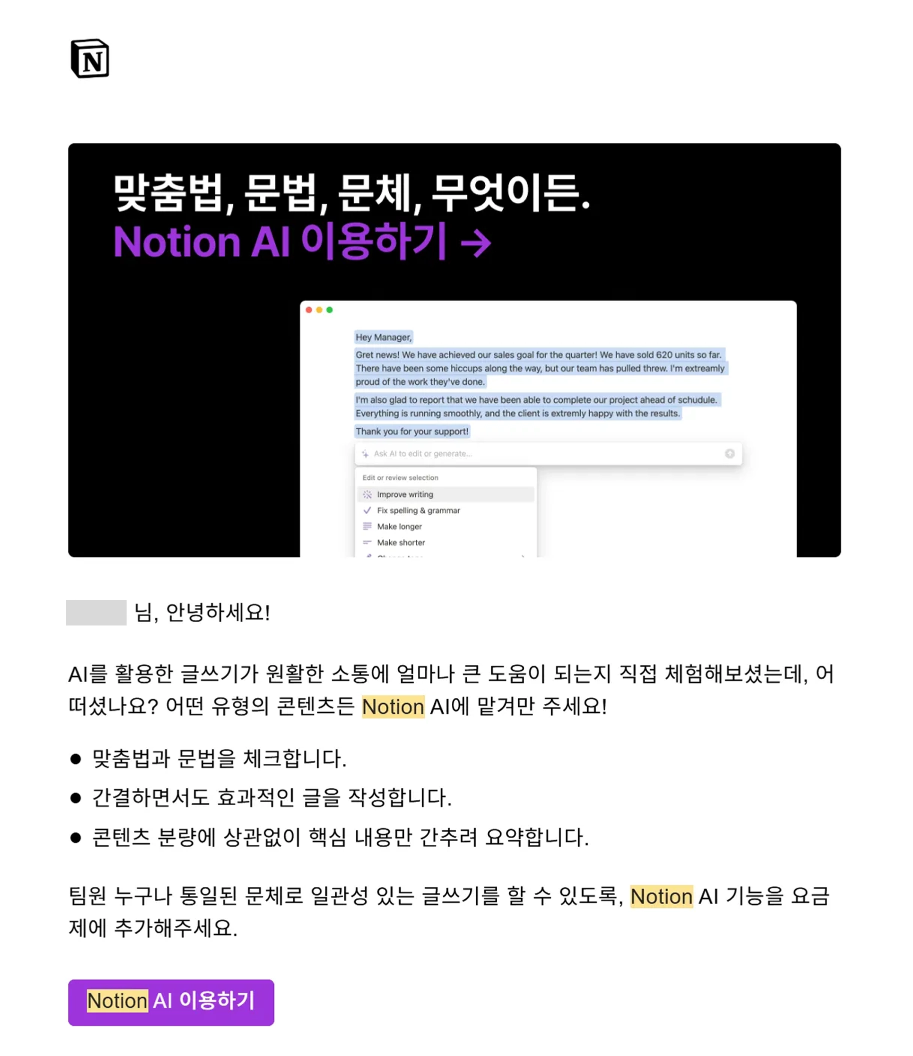 하지만 노션의 메일은 '나에게 필요한 정보를 정기적으로 요약해 주는 브리핑' 느낌을 줍니다.