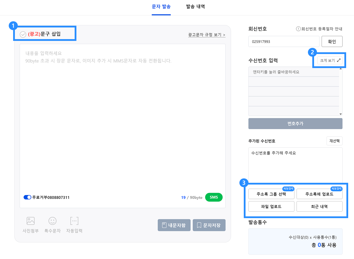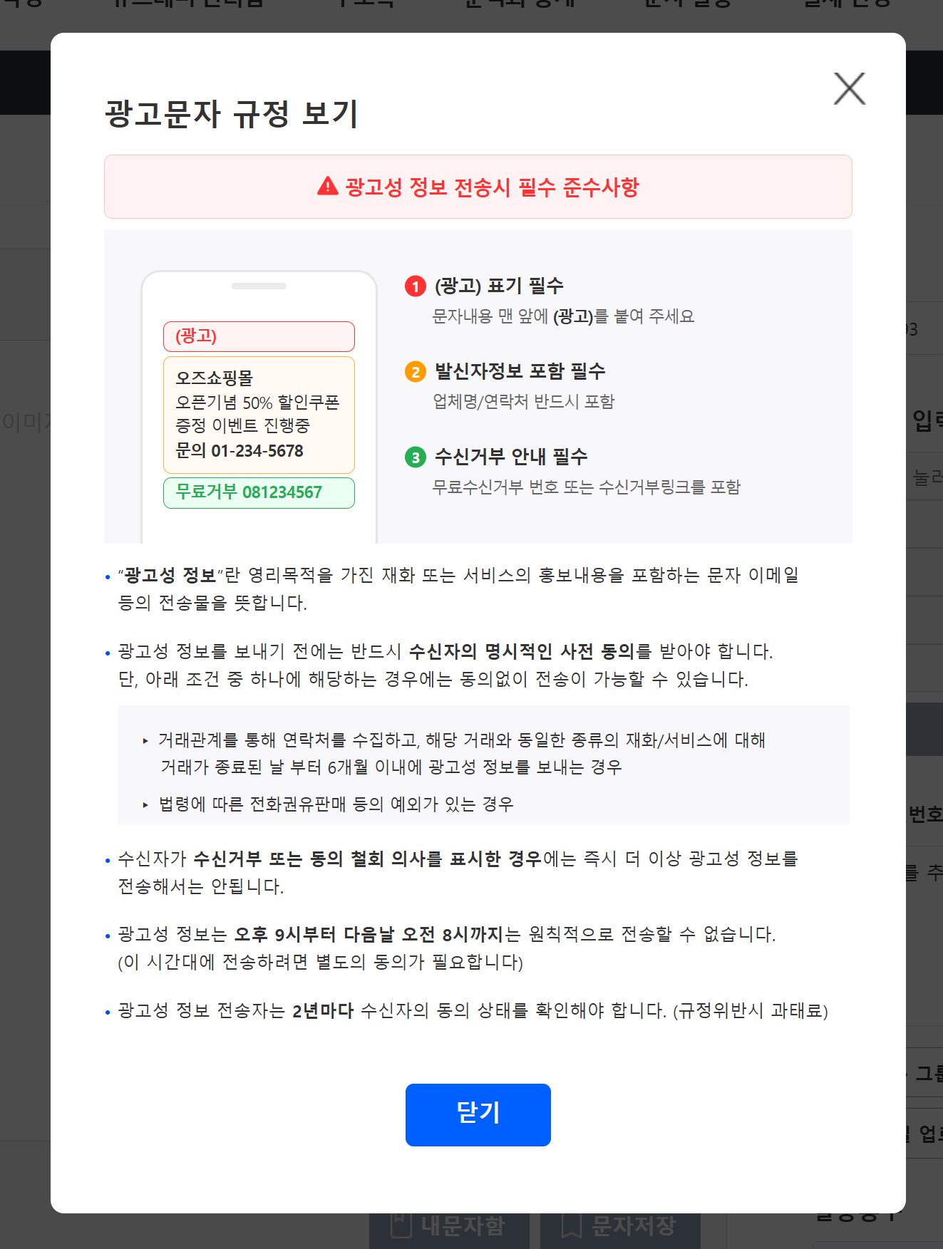 이러한 리스크를 줄이기 위해, 광고 문구를 보다 쉽게 삽입할 수 있도록 버튼 형태로 기능을 개선했습니다.또한, 수신거부(무료거부) 기능은 기본적으로 활성화된 상태로 발송되도록 변경되었습니다.