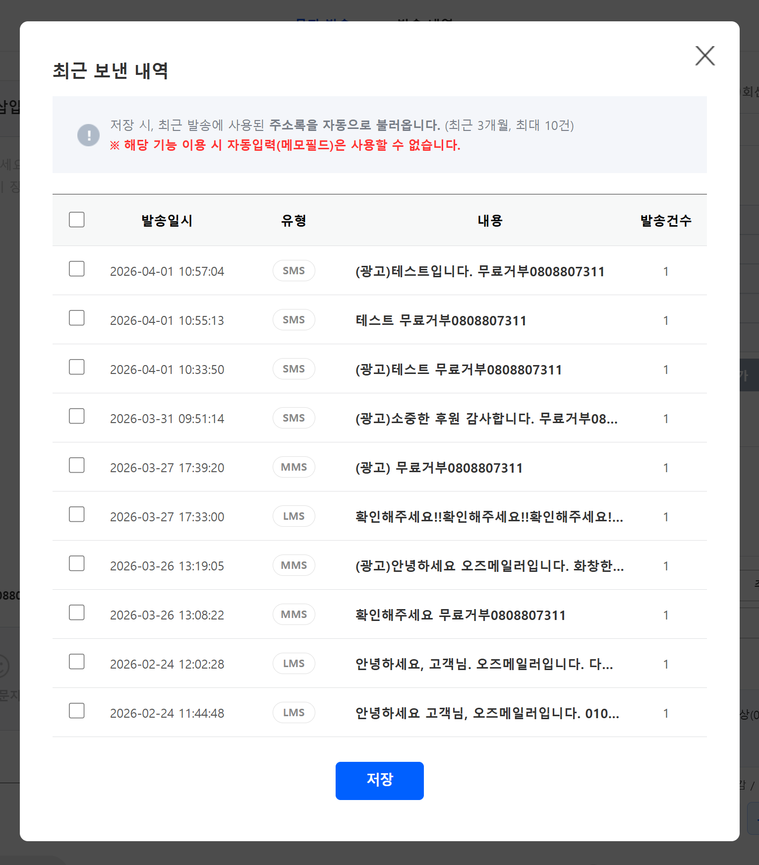 최근 발송했던 수신자 목록을 다시 불러와 간편하게 재발송할 수 있습니다.